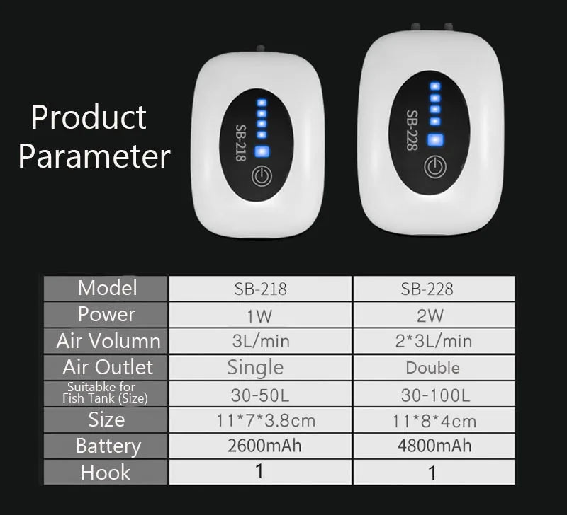 Bomba de oxígeno con batería de litio recargable para acuarios.